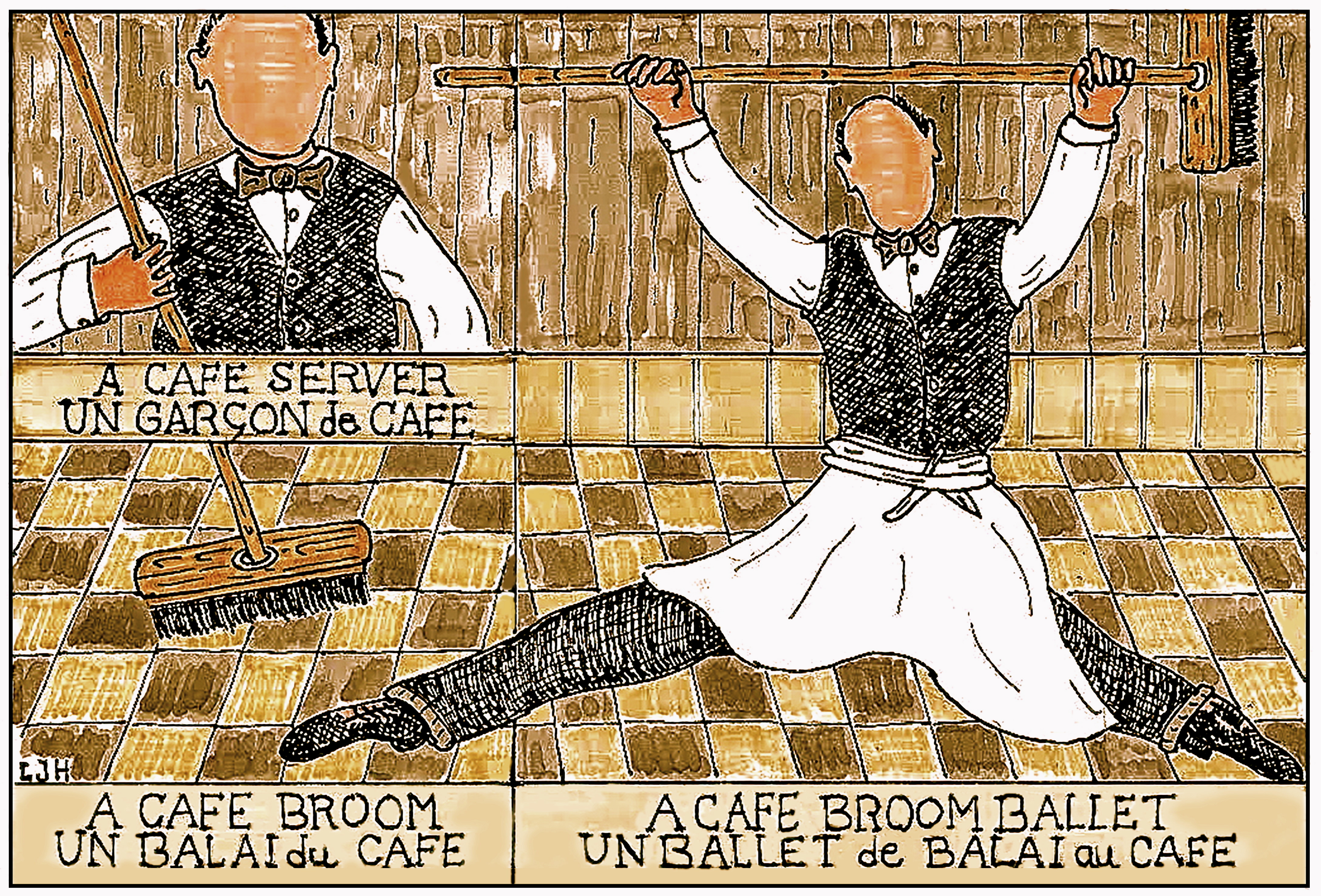 Googling broom history and its etymology in both French and English, I come across – par hasard (by chance) – the Anglo-French homophones le ballet (the dance) and le balai (broom), identically pronounced: bal-ai. Ah ha! My server, dressed in formal café black and white, is executing un ballet de balai – a broom ballet. Ennui morphs into bonheur (happiness).
