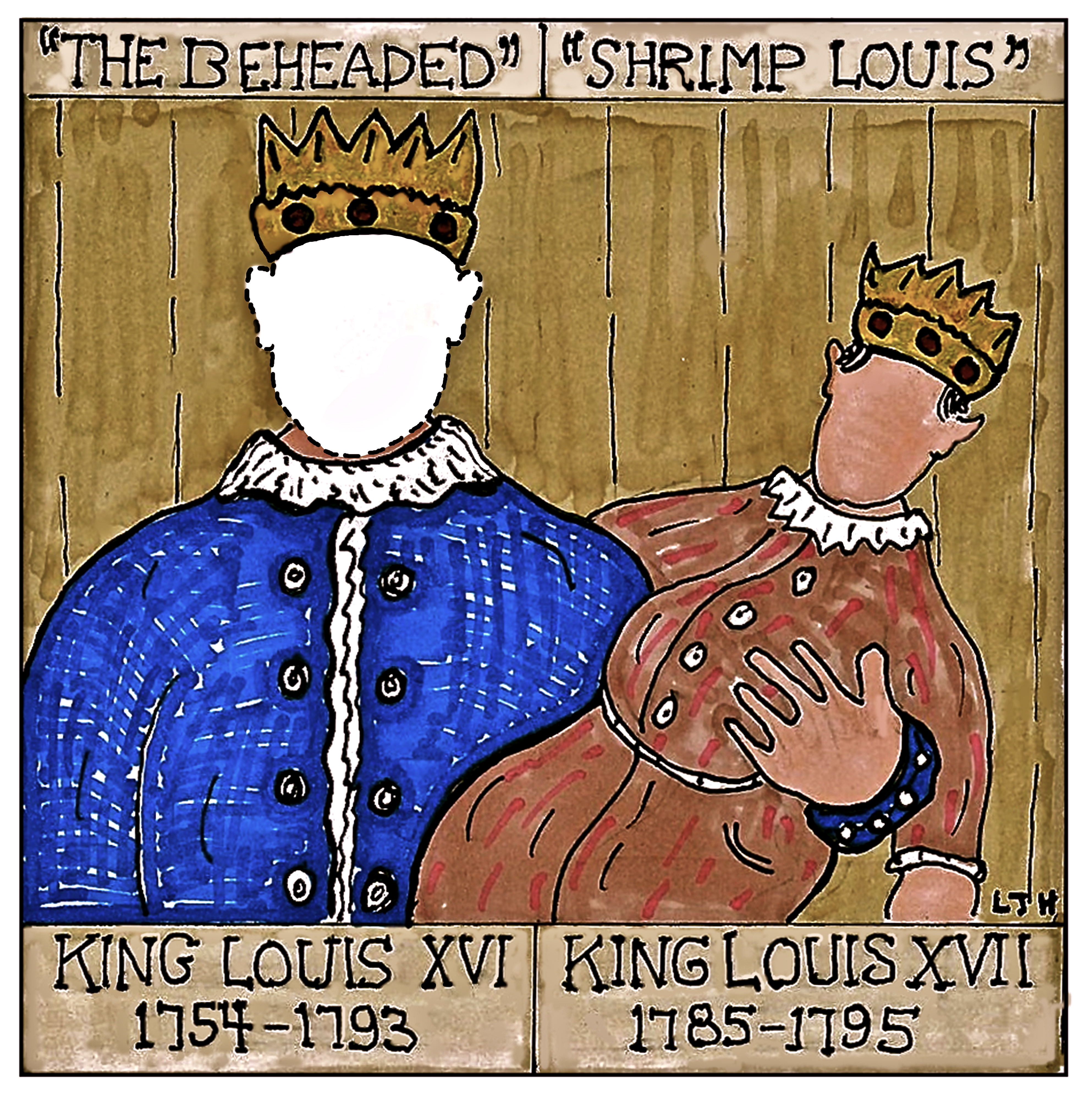 À propos of royal sobriquets, several of the eighteen French King Louis have earned less than flattering nicknames. In the 9th century there was “the Stammerer” (Louis II), in the 10th “the Lazy” (Louis V) and in the 12th “the Fat” (Louis VI). You could say that the French have had a love/hate relationship with their mostly House of Bourbon Louis. Honestly, I’m surprised there was never a “Shrimp Louis.” The likely candidate would be King Louis XVII, son of guillotined King Louis XVI and Marie Antoinette. Never attaining the throne after the revolution, the Dauphin died in prison at age ten. He didn’t live long enough to earn a snappy moniker. Now he has one, no charge.